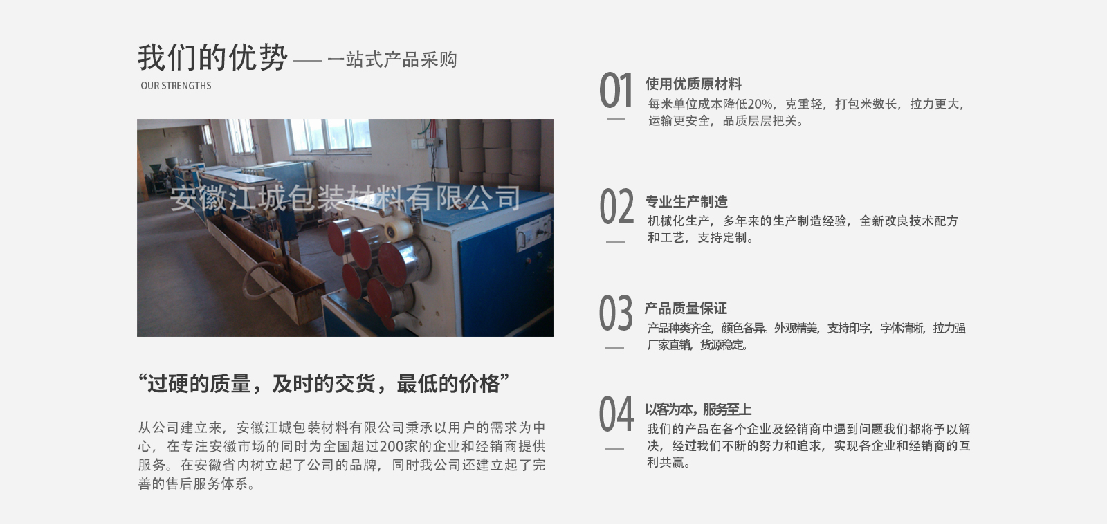 安徽江城包裝材料有限公司成立于2008年,注冊(cè)于2010年,公司總部設(shè)立在安徽蕪湖,是安徽省內(nèi)專(zhuān)業(yè)生產(chǎn)與銷(xiāo)售打包帶、透明膠帶的公司之一。公司主要效勞于大中小企業(yè),并大力開(kāi)發(fā)省內(nèi)經(jīng)銷(xiāo)商。公司以“過(guò)硬的質(zhì)量,及時(shí)的交貨,低的價(jià)格”,為企業(yè)的立身之本。希望用我們的不懈努力,帶給我們客戶(hù)大的效益。從公司建立來(lái),安徽江城包裝材料有限公司秉承以用戶(hù)的需求為中心,在專(zhuān)注安徽市場(chǎng)的同時(shí)為全國(guó)超過(guò)200家的企業(yè)和經(jīng)銷(xiāo)商提供服務(wù),“過(guò)硬的質(zhì)量,及時(shí)的交貨,低的價(jià)格”博得了縱多的企業(yè)和經(jīng)銷(xiāo)商的好評(píng),在安徽省內(nèi)逐步樹(shù)立起了公司的品牌,同時(shí)我公司還建立起了完善的售后服務(wù)體系。為我們的產(chǎn)品在各個(gè)企業(yè)及經(jīng)銷(xiāo)商中遇到的問(wèn)題予以解決,經(jīng)過(guò)我們不斷的努力和追求,實(shí)現(xiàn)各企業(yè)和經(jīng)銷(xiāo)商的互利共贏。